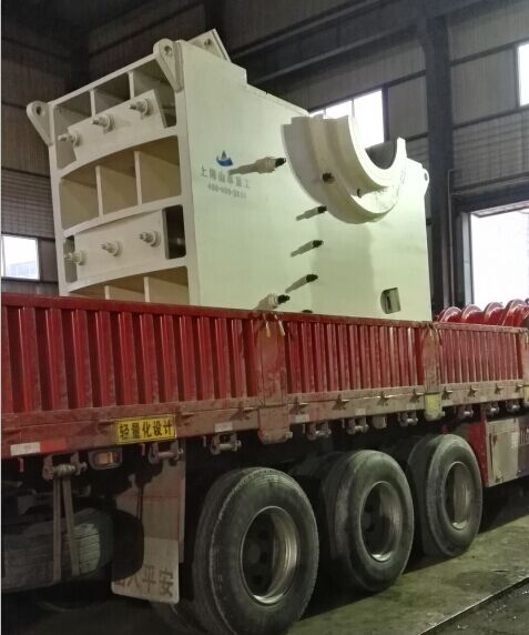 這是上周上海山卓重工的顎式破碎機的發(fā)貨現(xiàn)場,這一臺設(shè)備是發(fā)往貴州六盤水的。這些照片都是小編用自己的手機隨手拍的,雖然光線不是很好,但也可以清晰的看到設(shè)備上我們上海山卓的標志。這臺鄂破的型號是PE900*1200,屬于一個比較大的型號,它的進料口尺寸是900mm*1200mm,確實是一臺很大的設(shè)備!